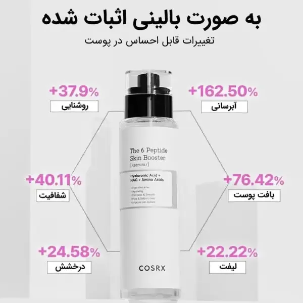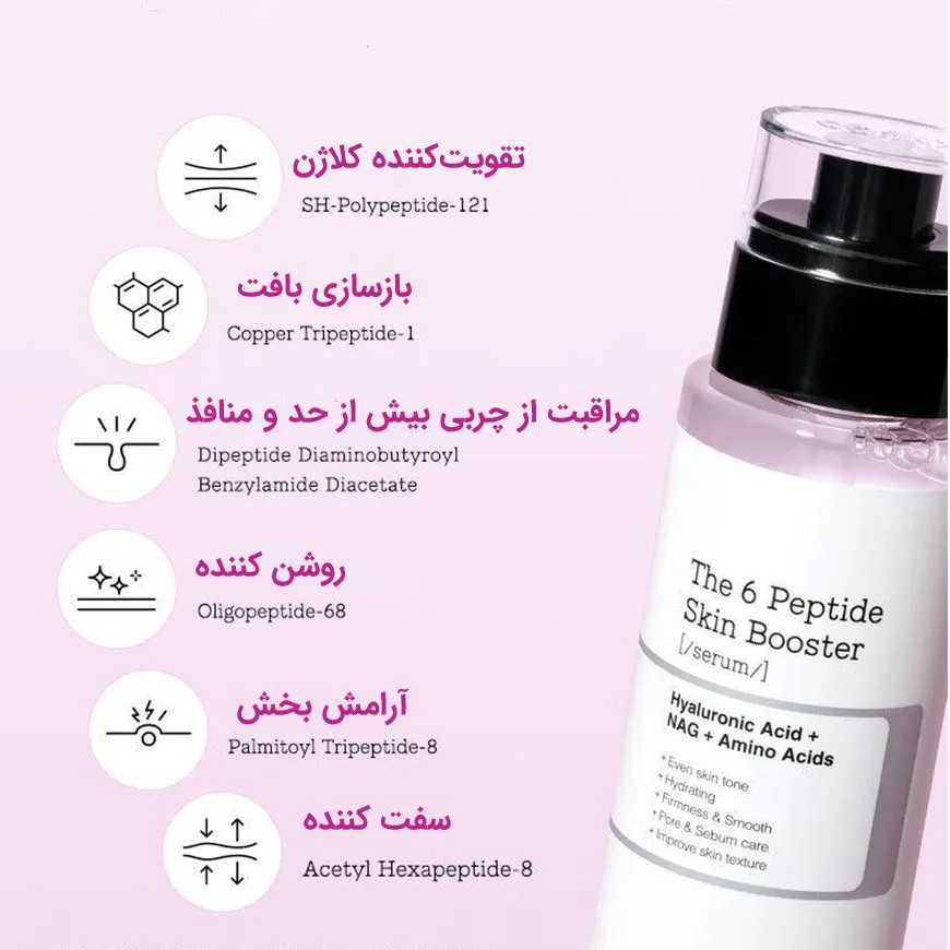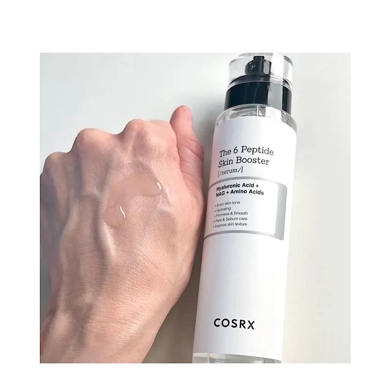 سرم **Cosrx The 6 Peptide Skin Booster** یک محصول پوستی پیشرفته است که با ترکیبی از شش پپتاید مؤثر طراحی شده تا عملکرد پوست را در سفتی، استحکام، کنترل چربی، کاهش خطوط ریز و بهبود بافت ارتقاء دهد. این سرم به عنوان یک **بوستر اولیه** در روتین پوست استفاده میشود و به پوست کمک میکند دیگر محصولات مراقبتی بهتر جذب شوند.